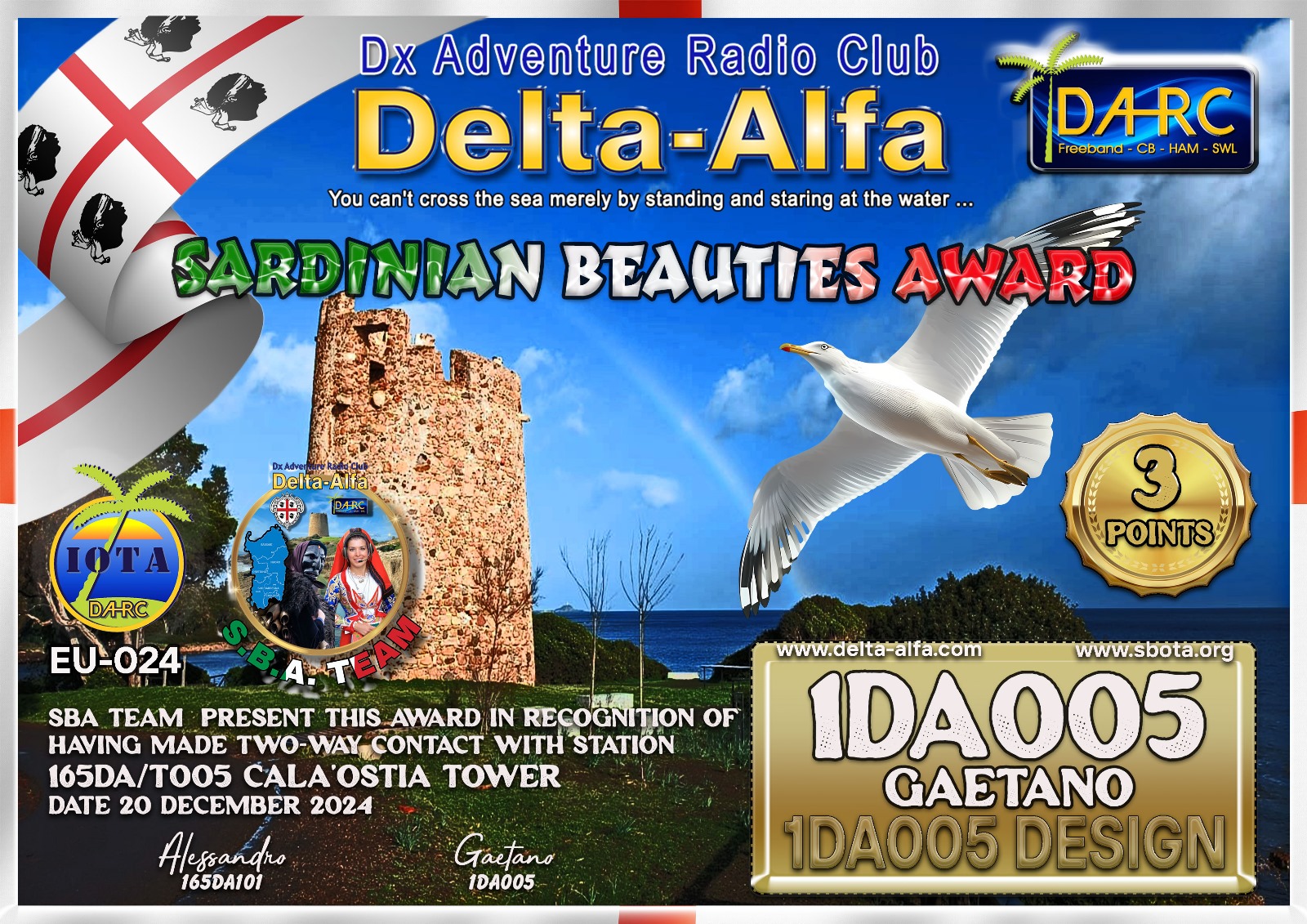 >>> 🐧NEW ONE SBA 2024 🐧<<< 165DA/T005 Cala d’Ostia Tower/ 2 POINTS./ DATE: 20 december 2024 start @ 13.30 UTC/ Freq. 7️⃣0️⃣5️⃣ SPLIT +10 Khz UP / PROVINCE 292 (Area metropolitana di Cagliari)/ Historical Region HR03 Campidano di Cagliari/ Municipality H088 (Pula)