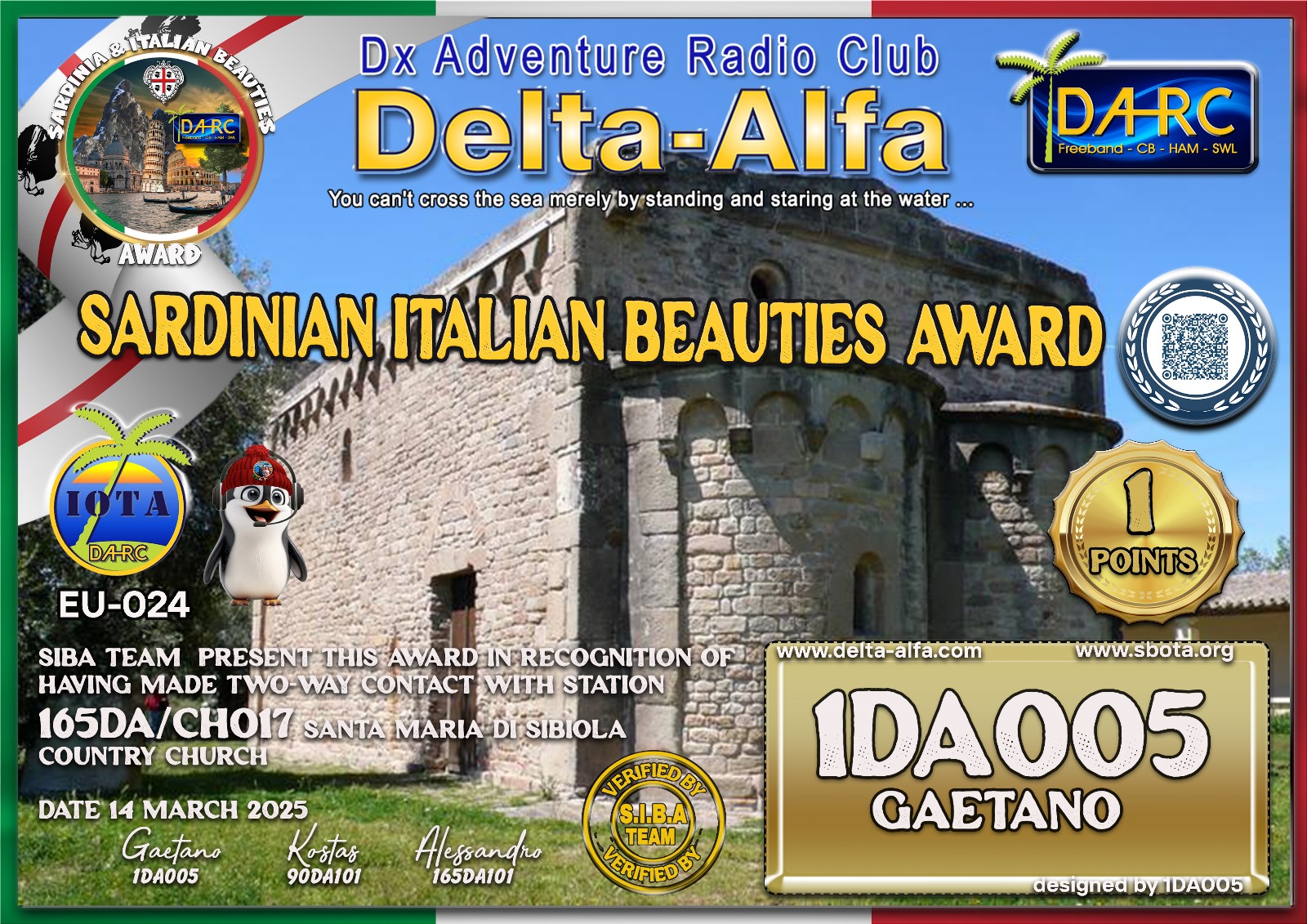>>> 🐧NEW ONE SIBA 2025 🐧<<< 165DA/CH017 Santa Maria di Sibiola Country Church (by 165DA101 Alex) / 1 POINTS./ DATE: 14 march 2025 start @ 14.30 UTC / Freq. 7️⃣0️⃣5️⃣ SPLIT +10 Khz UP / PROVINCE 318 (Città Metropolitana di Cagliari) / Historical Region HR07 Parteolla / Municipality I624 (Serdiana)