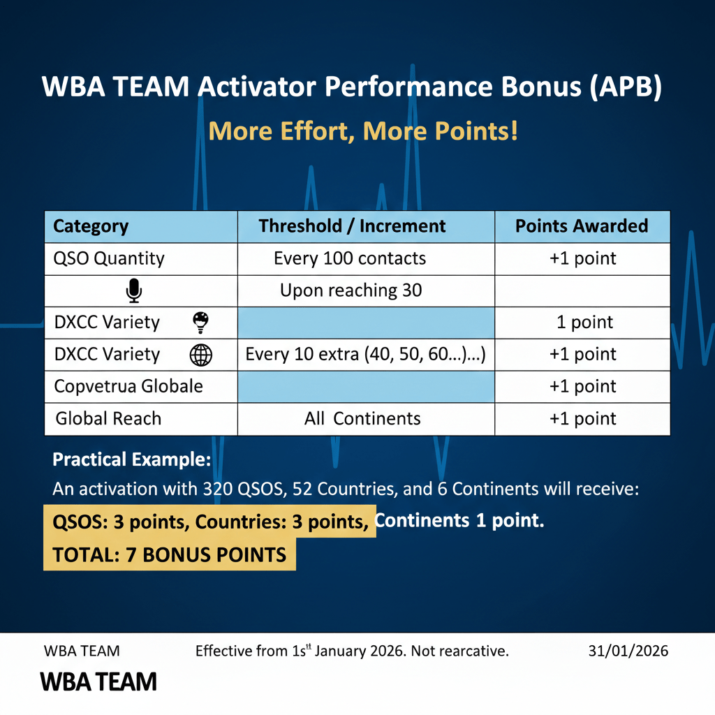 The WBA TEAM, aiming to recognize the technical expertise and dedication of activators in maximizing propagation windows throughout the day and achieving excellence in operational goals, hereby establishes the following additional scoring system.